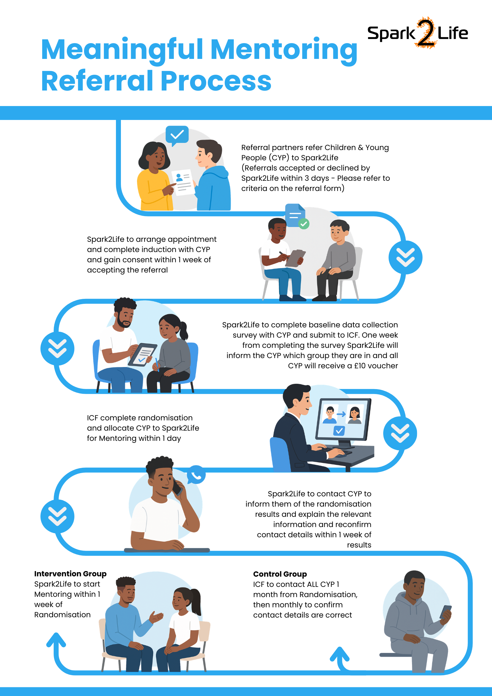 The project is conducted as a Randomised Control Trial, this means all the young people who are referred to the project are randomly assigned to one of two groups: one receives mentoring from Spark2Life, the other receive business as usual, where they continue to receive the usual support already being offered. This method of evaluation is considered one of the best ways to determine what works (and what doesn’t) by researchers and academics.